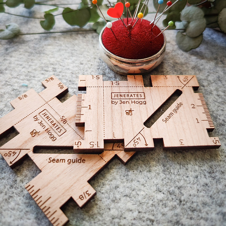 A nifty seam guide, useful for checking your seams and hems, in inches. Plus there's a cut out to mark a 45° angle, great for mitred corners. Made in 4mm cherry wood veneer - easy to pick up - and packaged in a hand-stamped glassine paper bag.